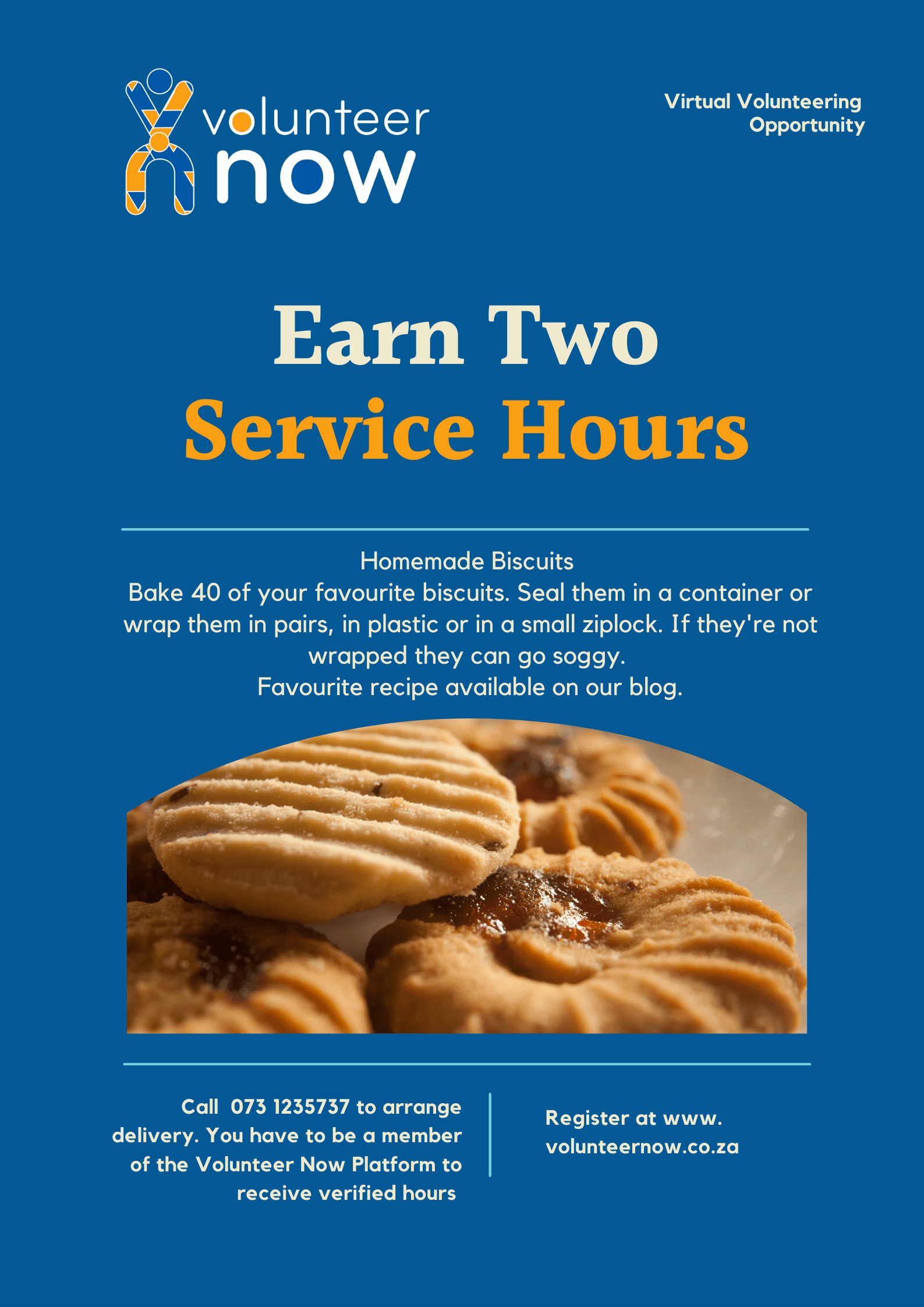 Bake and Donate 40 of your favourite biscuits, to earn 2 service hours. For full details please see the events page and download our favourite recipe.. Drop off at any of our collection points. Mark you donation clearly with your name, school and grade for verification purposes. Remember to take a photo of you with your donation. You will find it useful for your final report and essay.
