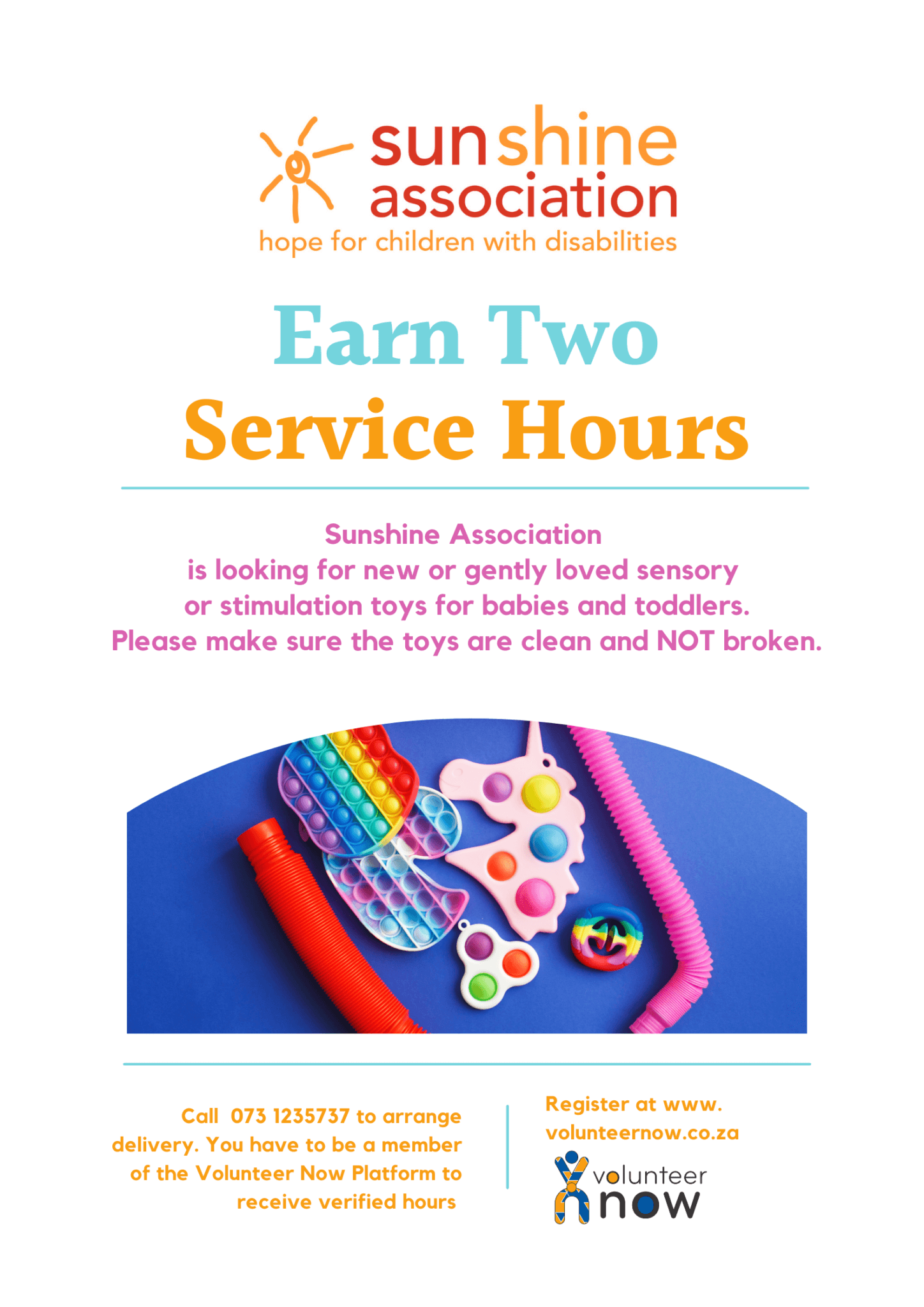 Sunshine Association is looking for gently used or new sensory toys. Earn 1 service hour for 4 Sensory Toys. Drop off at any of our collection points. Mark you donation clearly with your name, school and grade for verification purposes. Remember to take a photo of you with your donation. You will find it useful for your final report and essay.