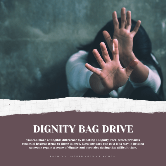 Earn 1 service hour for each dignity bag. Drop off at any of our collection points. Mark you donation clearly with your name, school and grade for verification purposes. Remember to take a photo of you with your donation. You will find it useful for your final report and essay.
